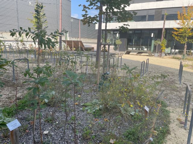 Im Zuge der Begrünung wurde der quadratische Park an der Oslo-Strasse umgegraben und mit einheimischen Pflanzen versehen. Das Resultat lässt Vögel, Regenwürmern und Insekten einen neuen Lebensraum auf dem Dreispitz zu.